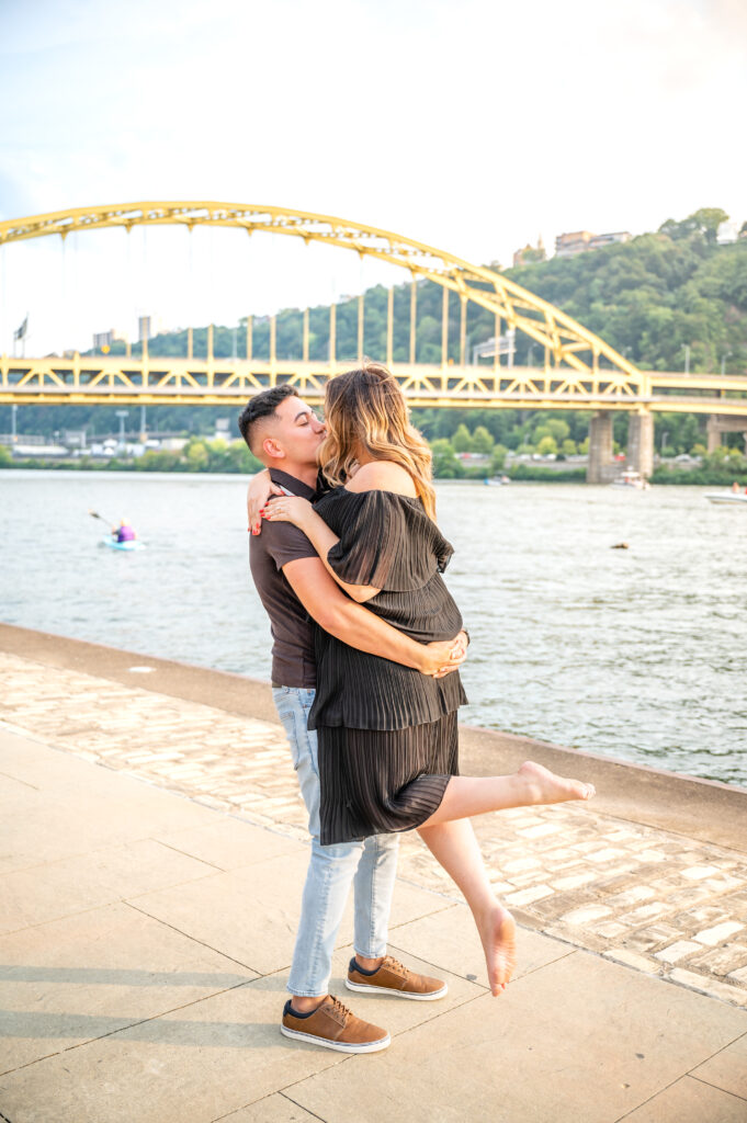 The Roberto Clemente Bridge is bold, colorful, and unmistakably Pittsburgh. It adds instant structure and visual interest to engagement photos and works especially well for couples who want something iconic and urban.